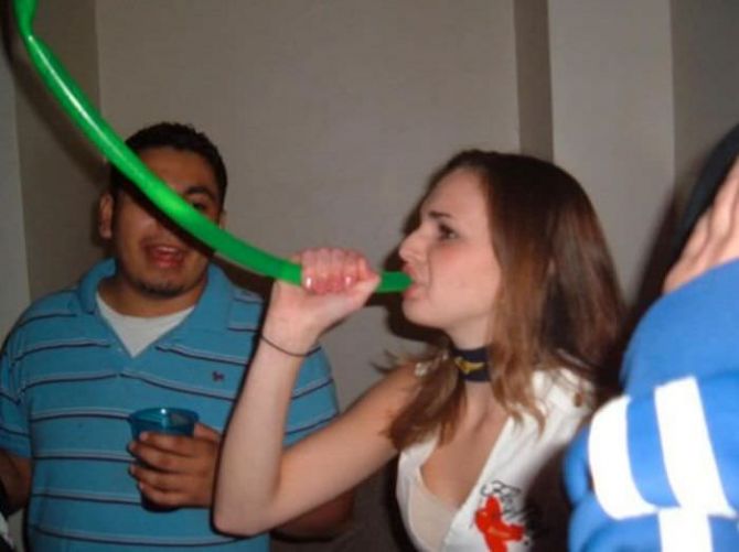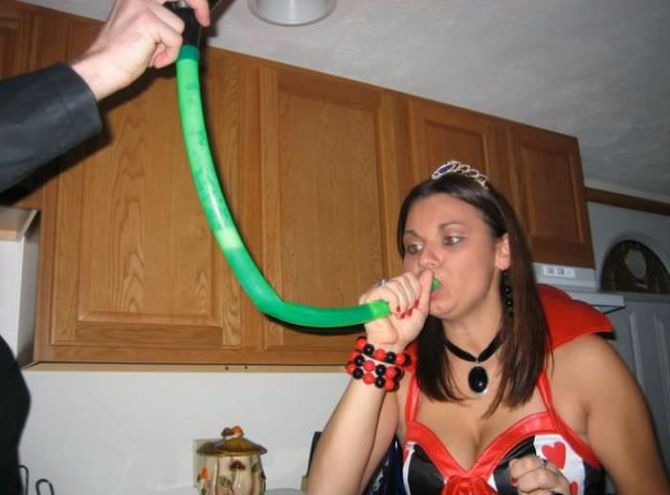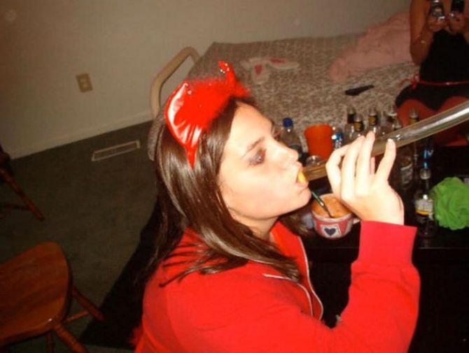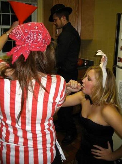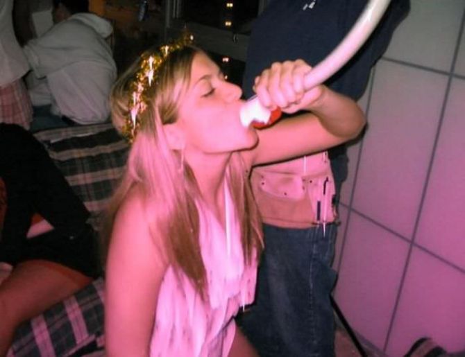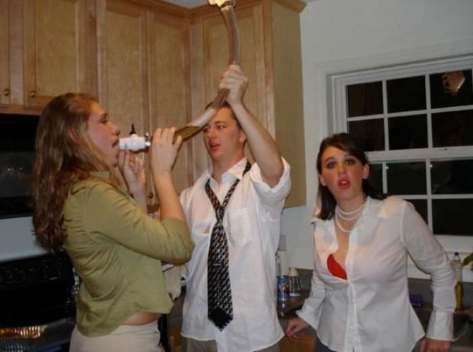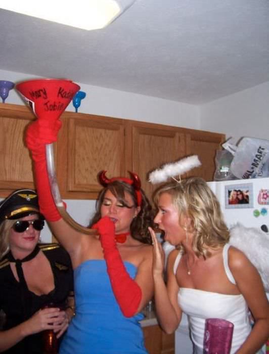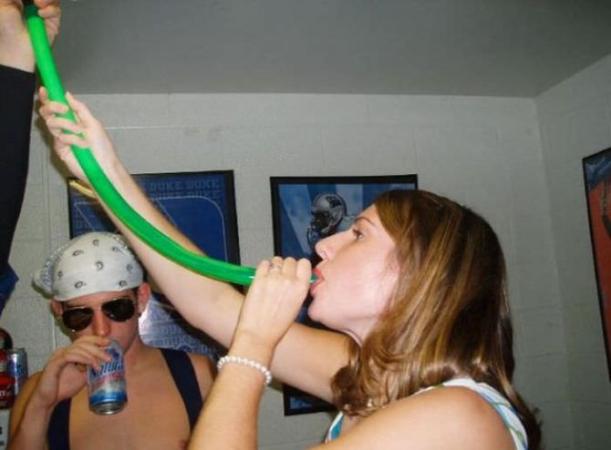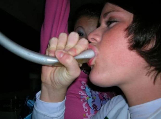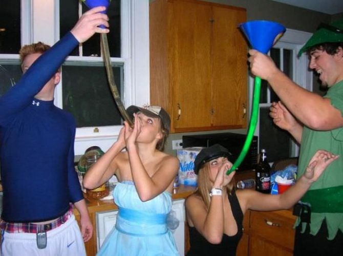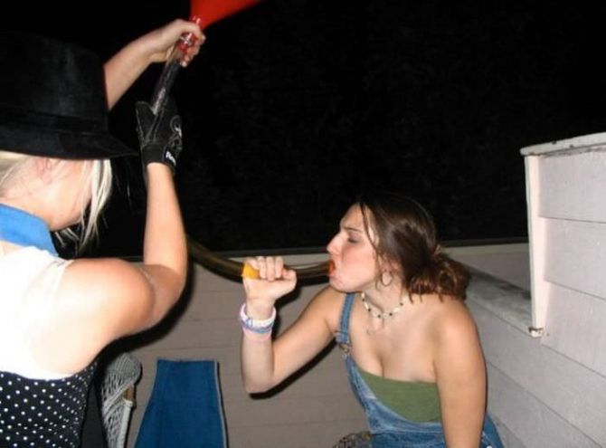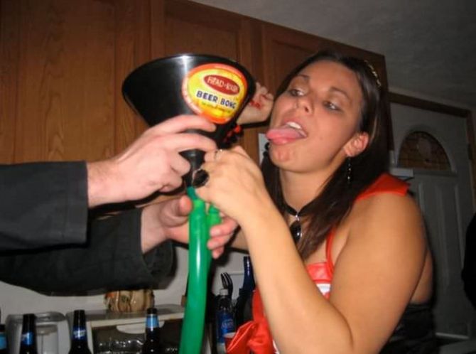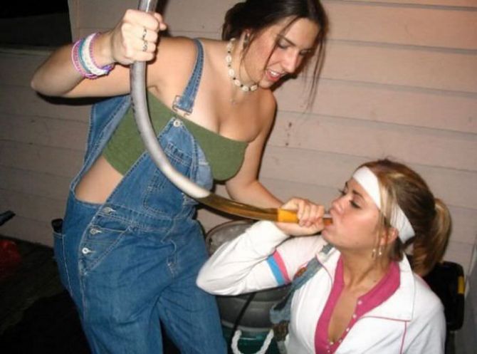 Пьяные девчонки на вечеринках пьют пиво из воронки.