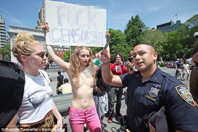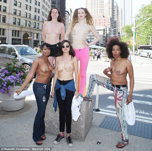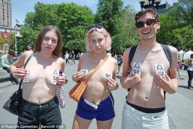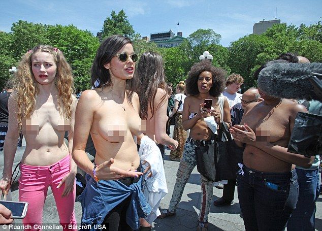 Вдохновившись примером дочери Брюса Уиллиса и Деми Мур, в воскресенье около 20 парней и дам приняли роль в демонстрации в Вашингтон-сквере против запрета демонстрации обнаженной груди в соц сетях, они прошлись топлес и уверяли прохожих присоединиться к ним.