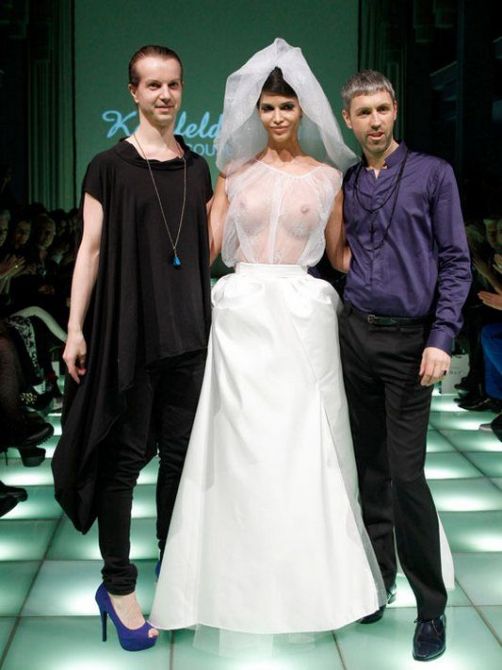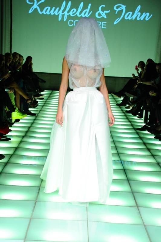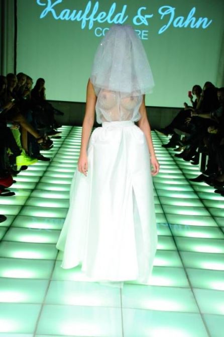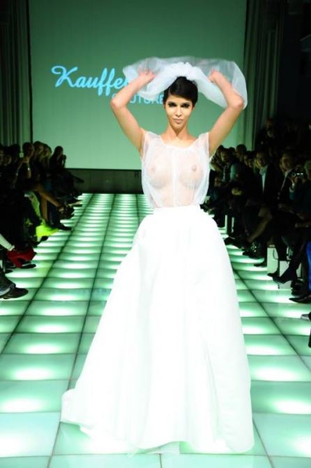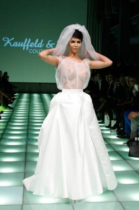 Она также выступает в клубах в качестве диджея, иногда становясь за пульт полностью голой. На днях Микаэла завершала престижный показ германской марки Kauffeld & Jahn Couture в рамках Недели моды в Берлине. Она вышла в фате и платьице жены, верх которого был полупрозрачным.